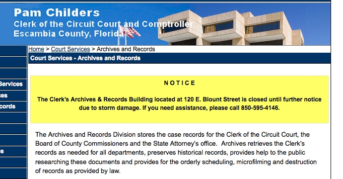 Historic documents are precious. Let’s hope the folks in the Escambia Court archives have good luck getting their facility in good order again, and that their records are safe.