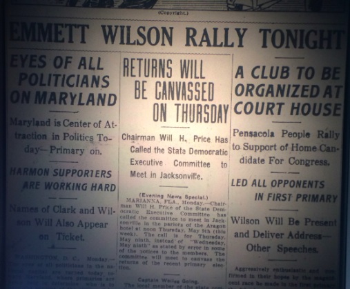 Although he didn’t have a t-shirt, he did have a club. True! When Emmett was running for Congress in 1912, his constituents organized an Emmett Wilson Club, and set one up in every county in the Third Congressional District (fyi — Florida’s current Third Congressional District is completely different from what it was in 1912).