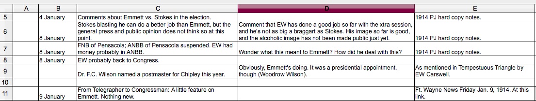 This is just a snapshot of one of my spreadsheets. I organize Emmett’s information by year, in chronological order. With this, I get an overview of what is going on with Emmett on (sometimes) a daily basis. I also put his family’s doings in this chart, and other important local news events that probably affected Emmett.