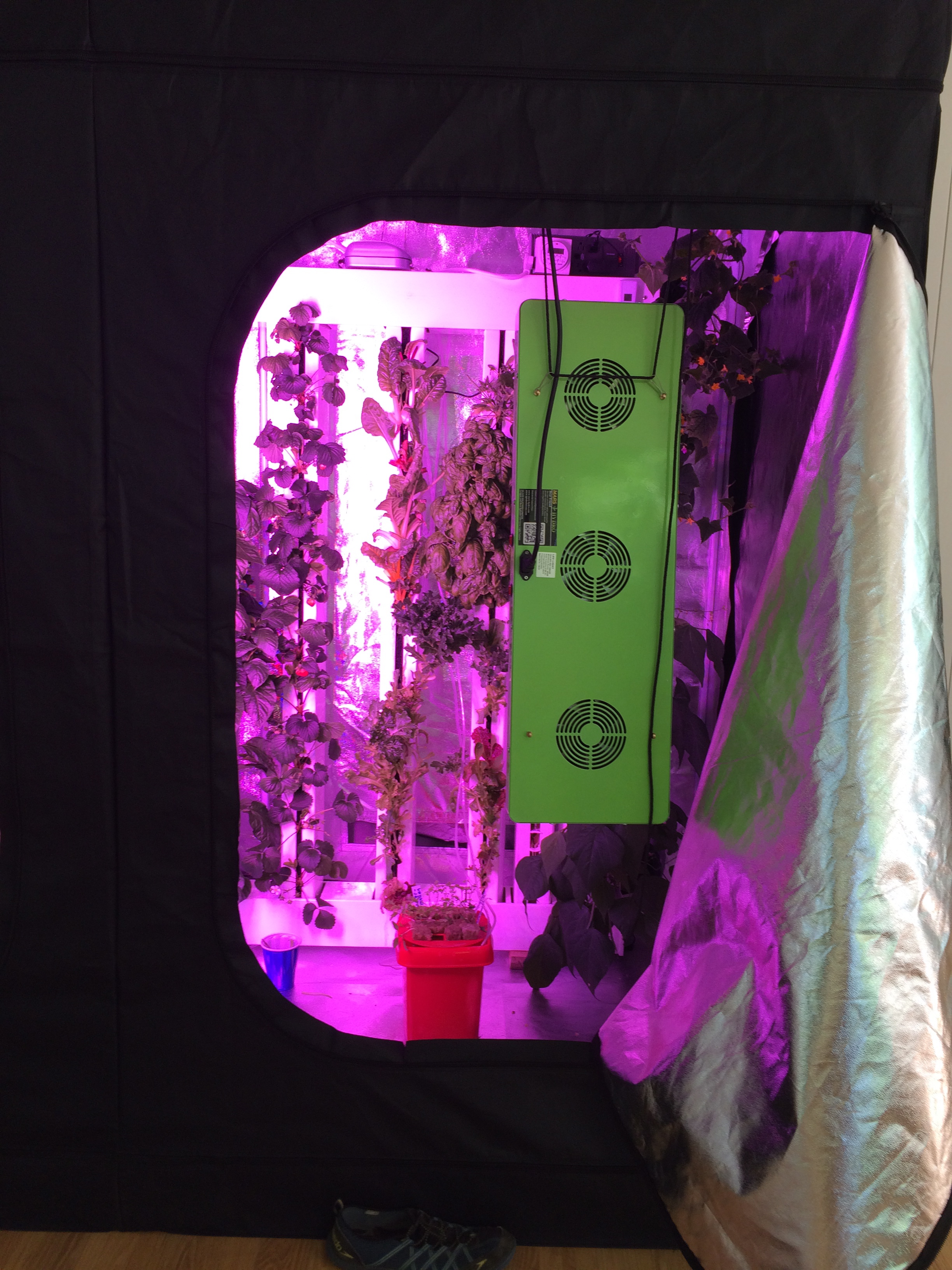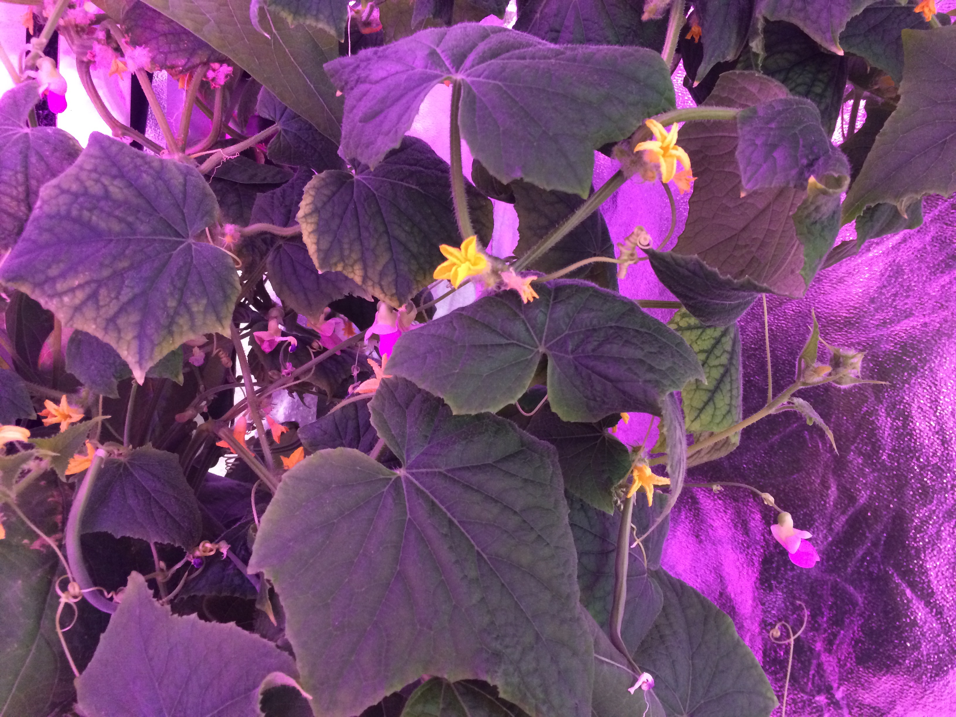 The light is actually red right now; it varies from green to blue to red depending on what is going on with the plants (blooming, producing fruit, resting). The yellow blooms are cucumbers. The pink blooms are string beans.