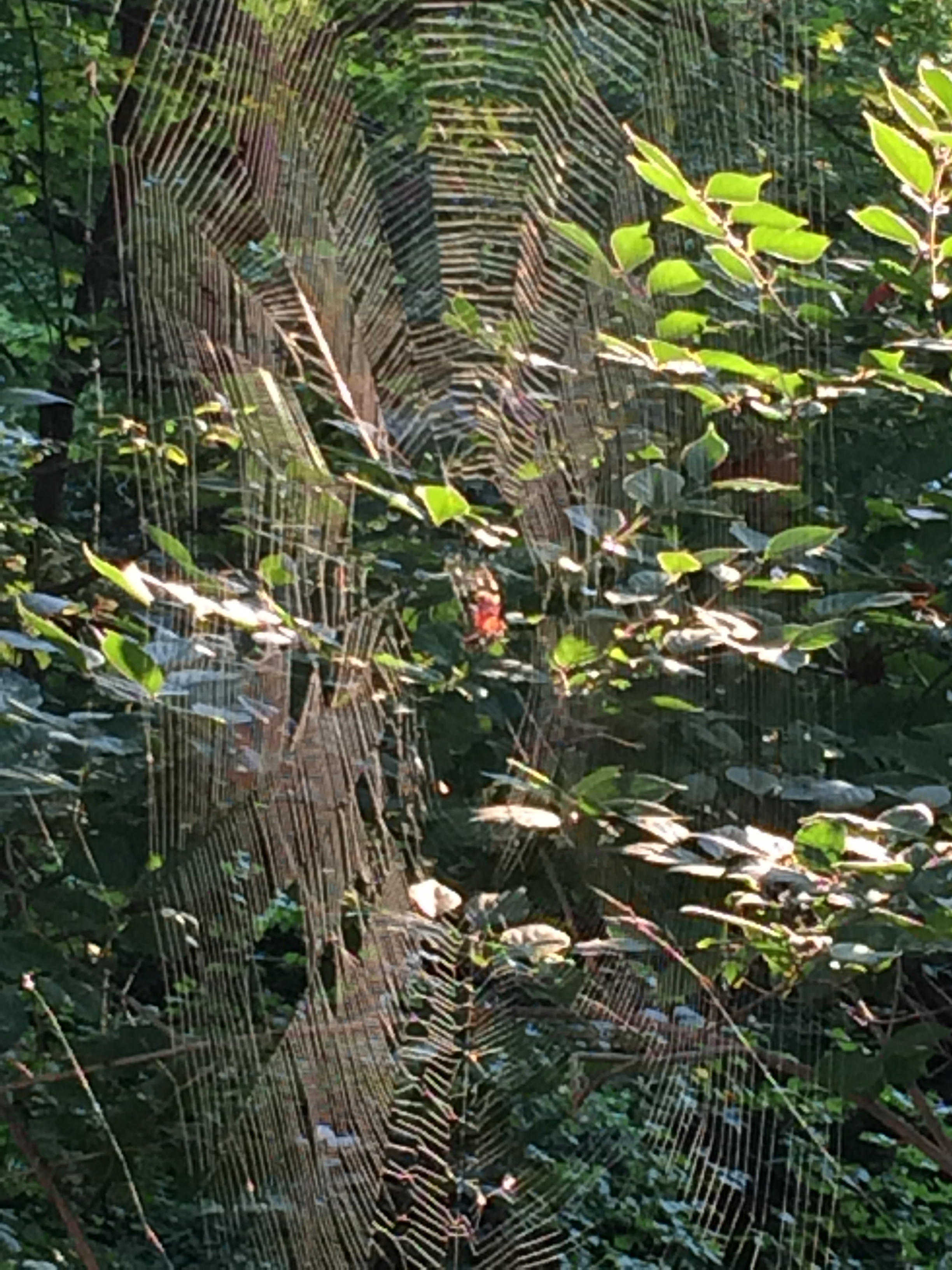 Impressive, isn’t it? Beautiful, actually, especially as it catches the sun. There’s symmetry and purpose in this spider’s construction. As I got close to snap the photo, it looked like she was doing a little repair work in the center. It looked like she had quite the party last night — guests for dinner, you know. Haha.