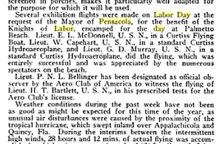 Aerial Age Weekly, vol. 2, Sept 27, 1915 reports that there was an aeronautics demonstration at Palmetto Beach. This was confirmed by an article in The Pensacola Journal for September 6, 1915, which reported that the Pensacola Carnival Association (the organization that put on the Mardi Gras parades) had “…a picnic at Palmetto Beach, which had the largest attendance of any event of this kind in the history of Pensacola. A Gun Club “shoot,” aeroplane flights by naval aviators, baseball games, and fireworks at night were the attractions,” Money that was collected for the events at Palmetto Beach went toward the 1916 Mardi Gras parade celebrations — floats, decorations for the street, and so forth.