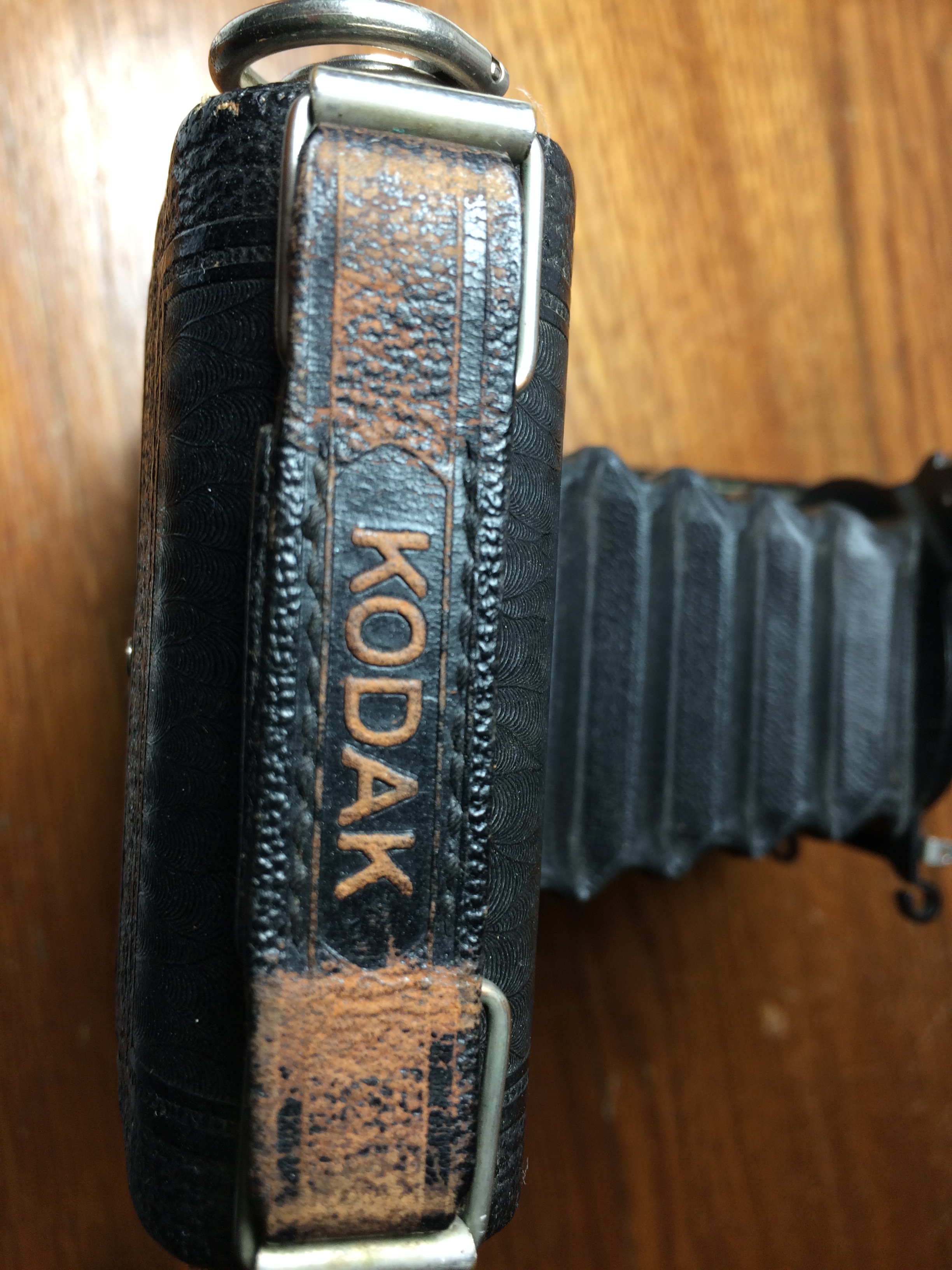 The camera is in great shape. The little bellows slid out easily, without much effort. The shutter works fine. Nothing is stiff or broken; the leather strap across the top shows some wear, but for a camera that is 100 years old, it is in fine condition.