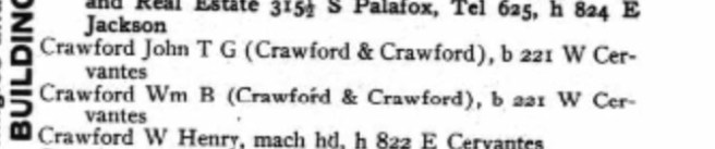 The Crawford brothers practicing law. The partnership didn’t last but a few years. John Crawford had only been admitted to the bar in 1906. Their office was located at 300 Thiesen Building. Source: 1907 Pensacola City Directory, Ancestry.com