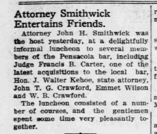 And, it stands to reason that the Crawfords would have been known well to the host of the luncheon, John Harris Smithwick, who was J. Walter Kehoe’s law partner.