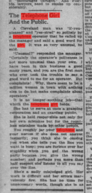 A portion of an editorial about telephone girls. Source: The Pensacola Journal, February 1, 1912. http://www.chroniclingamerica.gov