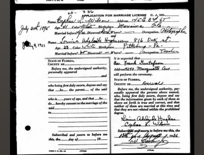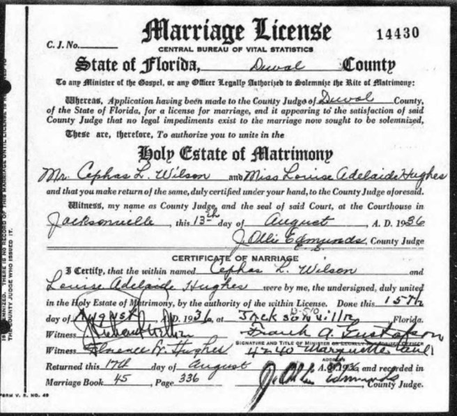 The house Cephas Jr. listed as his residence in the marriage license application is still standing; Louise’s home at 816 Oak Street is not. And the house where Cephas Jr. and Louise Hughes Wilson lived in Jacksonville (built in 1940) is still standing.