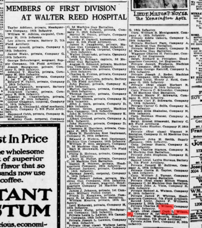 Cephas L. Wilson Jr.’s listed as a patient at Walter Reed (lower right corner, highlighted in red). From The Washington Star, August, 1919. Source: ChroniclingAmerica.gov