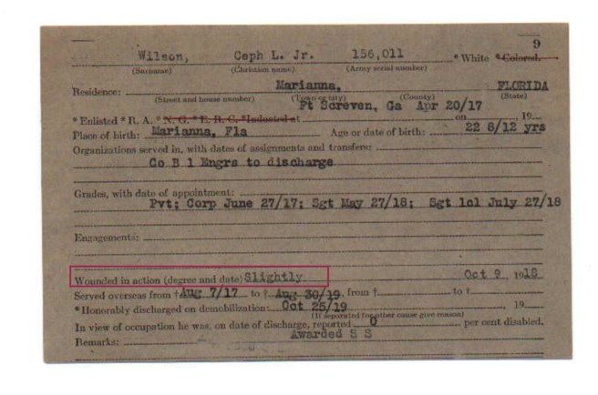 The notation on Cephas Love Wilson Jr.’s WWI service card that his injury was ‘slight’ is somewhat incongruous with the fact that he was recovering at a French hospital, and at Walter Reed Hospital, for months. Image source: Floridamemory.com