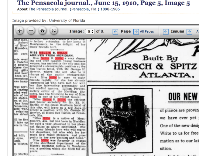 Here’s the article I found on Nellie when she moved from Meridian, Mississippi to Pensacola in 1910: