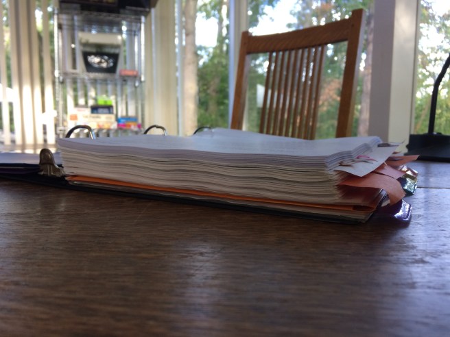 Emmett’s research binder. Not my desk, by the way. This is too clean.