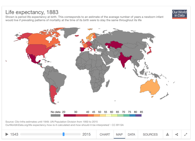 The website, Our World in Data, has an interesting interactive chart mapping life expectancy rates starting from the year 1543 to 2015.