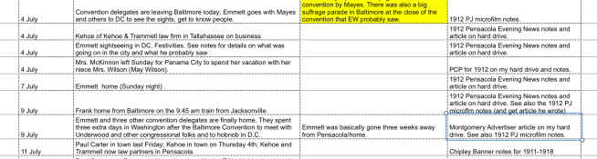 Constructing Emmett’s story has also taken a lot of time — five years, so far. The time involved in collecting the data is one thing; but it takes almost as long (if not longer) to organize seemingly disparate pieces into a logical, detailed timeline of events, and unfortunately, I underestimated that part of the research process. Here again, spreadsheets to the rescue. To keep myself from going insane with the (literally) thousands of pieces of Emmett information, I created something I call “Emmett’s Life Timeline” in spreadsheet.