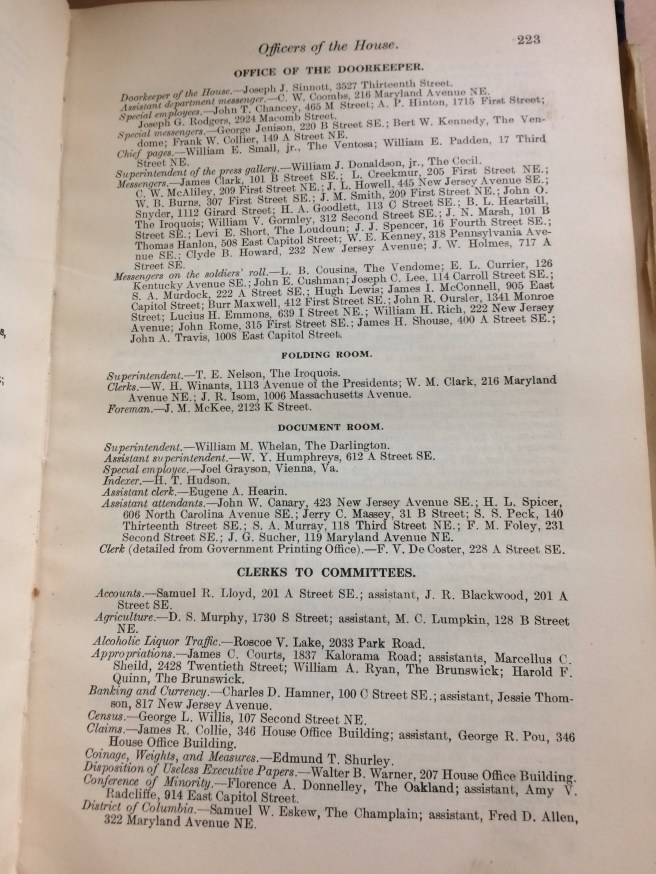 These old Congressional Directories are treasure troves of interesting details. For example, see the first entry — the Doorkeeper of the House of Representatives’ home address is listed! And bonus: