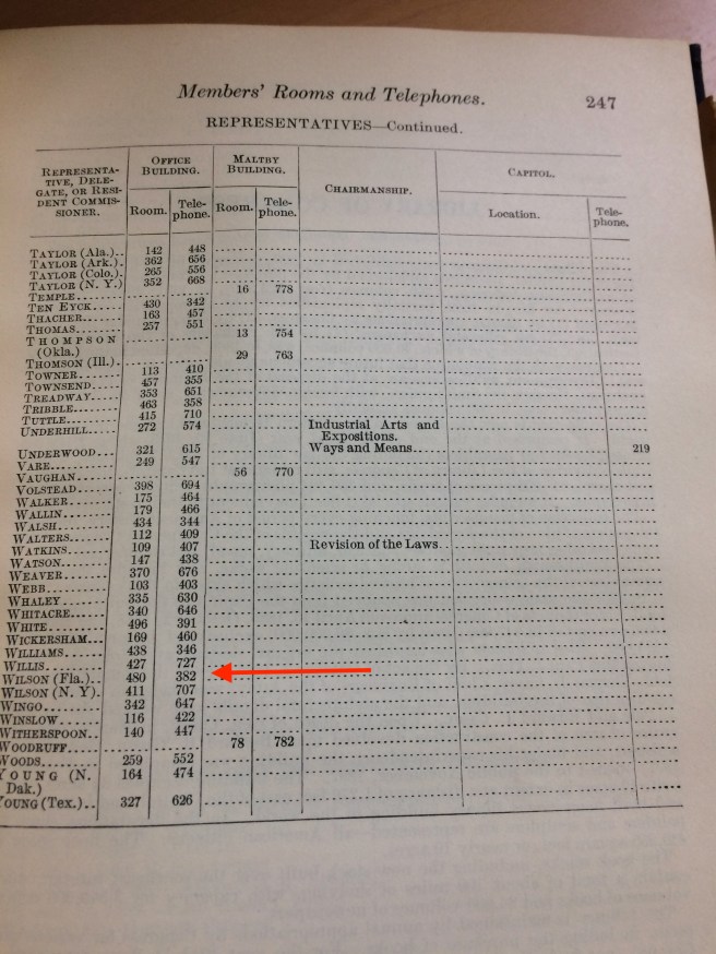 Emmett is listed several times in the directory; his biography, his committee memberships, and his residential address while in Washington (Congress Hall Hotel, in case you were wondering). And in case you wanted to visit or call Emmett, here’s how you could find him in the Cannon House Office Building: