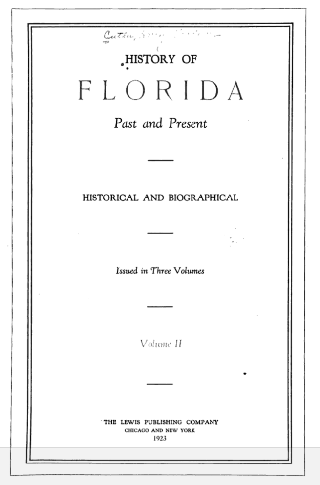 In 1923, Harry Gardner Cutler published a ginormous compendium of Florida biographies, complete with similarly sized title History of Florida: Past and Present, Historical and Biographical.