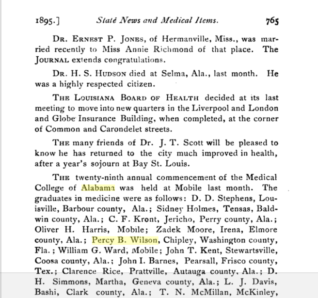 A confirmation of Percy’s graduation from the Medical College of Alabama in Mobile, 1895. The school closed in the 1920s, and records were transferred to the University of Alabama in Tuscaloosa. Source: Louisiana State Medical Society Bulletin, 1895, via Google Books
