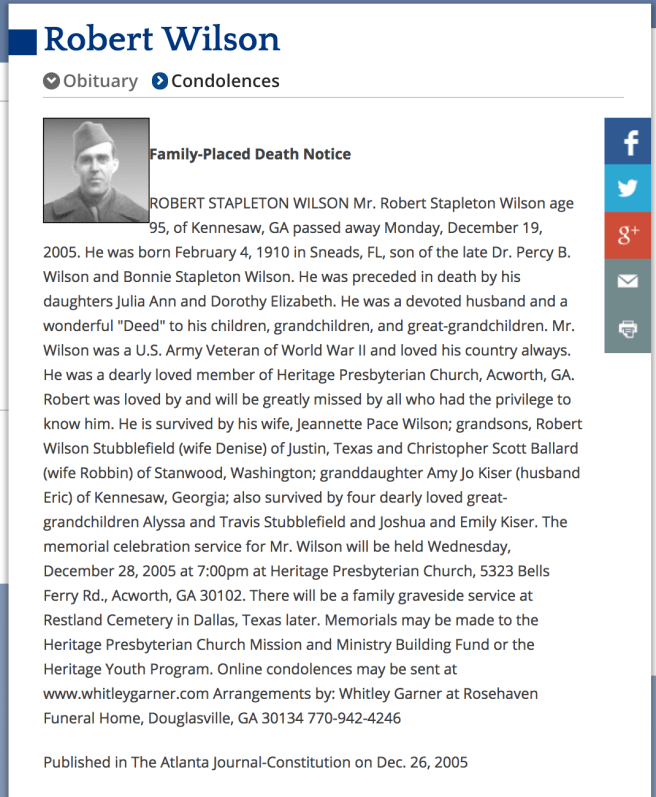 Obituary of Robert Wilson, son of Percy Wilson. Source: Legacy, via Atlanta Journal-Constitution