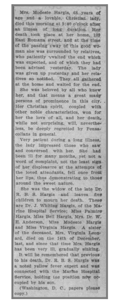 It’s the obituary for Modeste Hargis‘ mother, Modeste Sierra Hargis, from the Pensacola Daily News, Friday, January 22, 1904, page 1: