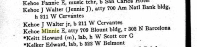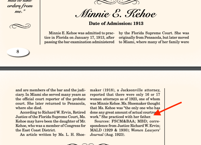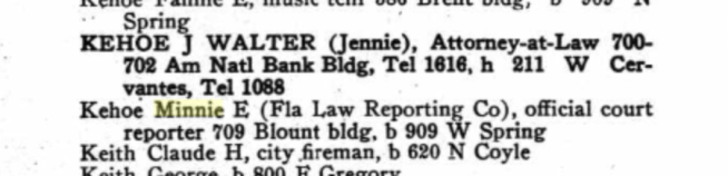 Yes, Minnie was admitted to the bar in 1913; she worked in Pensacola for many years, then moved to Miami to be near family, namely her prominent brother J. Walter Kehoe, then she returned to Pensacola.