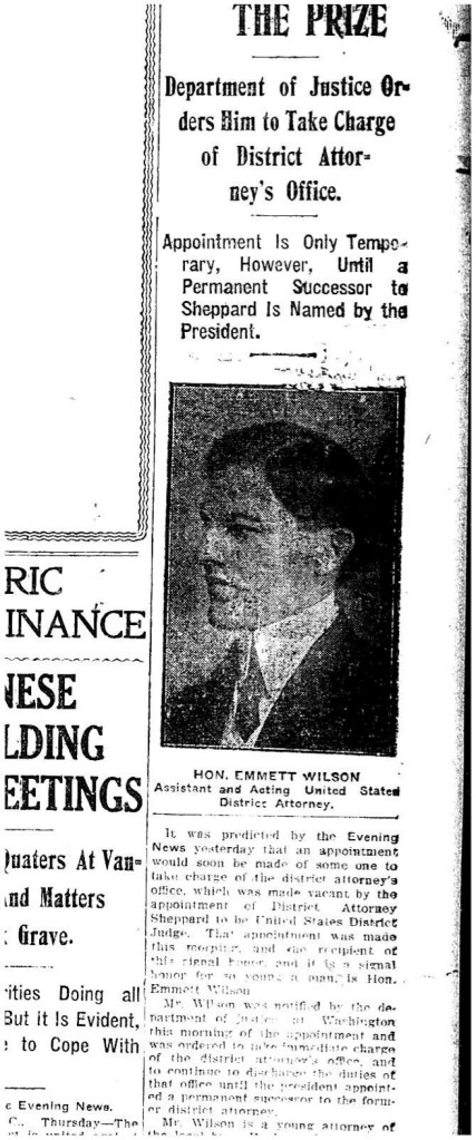 This would prove to be one of many examples in the articles I found that Emmett, a die-hard Democrat without a lot of experience but good family and political connections, landed this job during a Republican administration out of nowhere — he’s even quoted in the article as being surprised he got the appointment, because he hadn’t even applied for it. Other candidates with more experience were not pleased, and his lack of experience despite being promoted to prominent, lofty positions was turning out to be regular thing across his career.