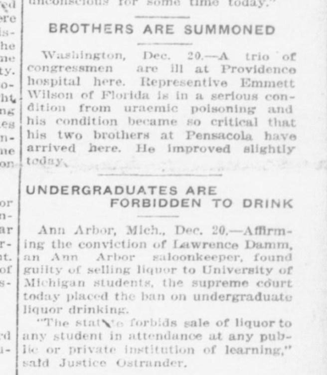 Uremia, or kidney failure. I wasn’t entirely surprised to see this, because I’d read that in December, 1914, while Emmett was a Congressman, he was taken to Providence Hospital in Washington, D.C., the cause being uraemic poisoning.