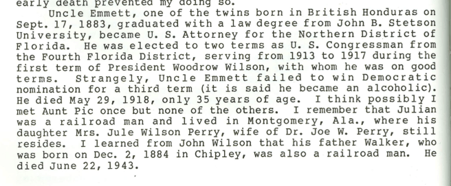 Excerpt from Belle Fannin Wilson’s genealogy. It’s another mention of alcoholism, but Belle doesn’t seem to be absolutely certain of Emmett as an alcoholic.