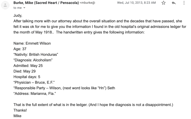 About two weeks after following up with Mike Burke with the proper Wilson ancestor information, and approval from Sacred Heart Hospital’s general counsel, I received this email message: