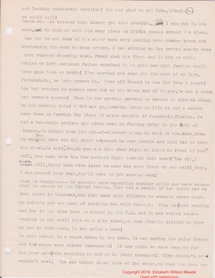 Back to Honduras — My parents were expecting another child and were persuaded to return to the United States. They had a couple of boy twins and me down there in Honduras, and that made nine children to educate where there were no schools and not much of anything but wild country. They had been sending one boy at a time back to school in the U.S. and it was rather heartbreaking to put small boys on a ship alone, so they finally decided to give in and go back Home. It was quite a move!
