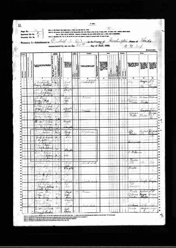 A few weeks ago, I wrote about the 60 acres that Emmett’s grandfather gave to his mother, Elizabeth Maxwell Wilson, upon the Wilson family’s return to the United States from British Honduras. The exact location of the original Wilson homestead has long eluded me. But thanks to county tax records, an 1885 Florida State census, and help from a local genealogist/historian I chat with occasionally in the Washington County (Florida) Genealogy Facebook group, I narrowed the location to near Corbin Road. It’s not the exact location yet — but I’m closer to it.