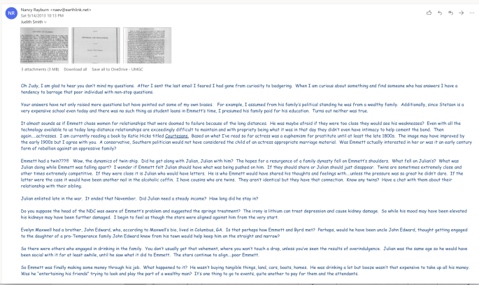 Nancy had attached screenshots of Robert H. Anderson’s biography to her message, and the note had lots of interesting questions. Source: Correspondence between Nancy Rayburn and Judy Smith, Sept. 14, 2013