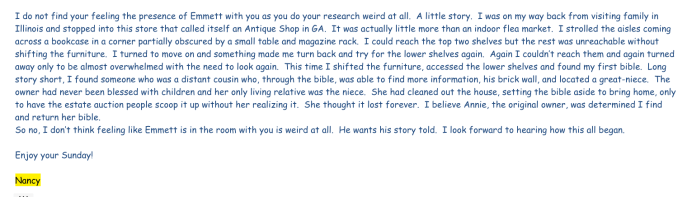 Our correspondence started out with lots of questions — and I was frankly glad to have someone who was interested in talking with me about Emmett in this depth. It helped me think about his life and death. I was working mostly solo on Emmett for about five months, and all of the facts in my head and on my Excel spreadsheet were needed airing, so to speak.