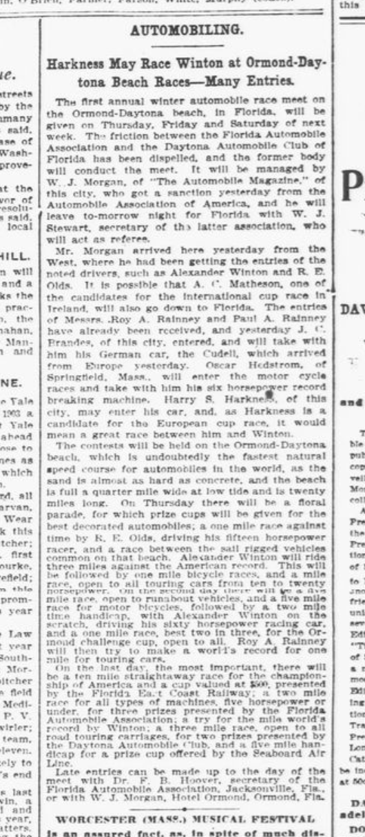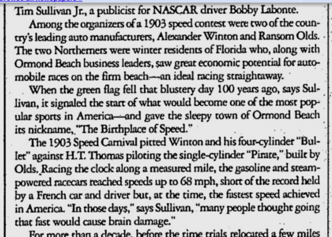 “Supposed to be a race, the best three or four going up for the Ormond challenge cup. Well, when Winton drove up in his fancy contraption earlier today, the other drivers got scared, withdrew their entries, the sonsabitches,” he said, gesturing to the group of automobiles and drivers still parked at the beach about a quarter of a mile down from the starting line. “Excuse me,” the timekeeper apologizes to the ladies standing nearby. “Winton will race anyway; go for a straightaway speed record again, but he’ll also race H.T. Thomas and his Pirate later today. You won’t be dissatisfied. But don’t be surprised if the drivers get brain damage, going that fast,” the timekeeper adds.