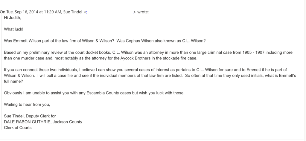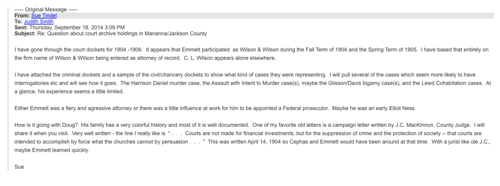 Rather, Emmett’s move up the ladder was more influence than anything, as he was working in the shadow of his talented and wily older brother, who was an exceptionally well-established lawyer in Florida. She and I would go back and forth over the next several days, exchanging email messages discussing other Wilson family and friends who lived in Marianna (J. Walter Kehoe, W.E.B. Smith [Emmett’s brother-in-law] and the McKinnon family, who were related to the Wilsons by marriage).