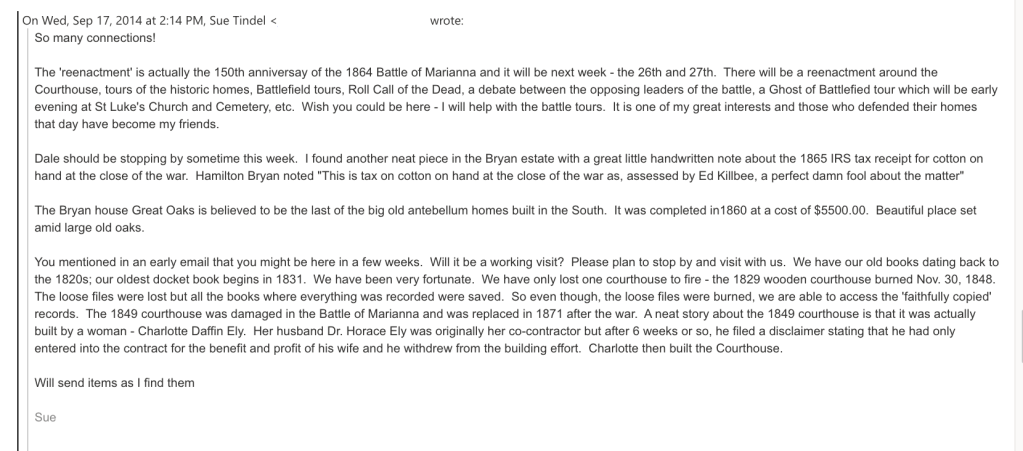Within a day, Sue and I exchanged several email messages, some of which included interesting historical background about Marianna and local residents who had connections to the Wilson family.: