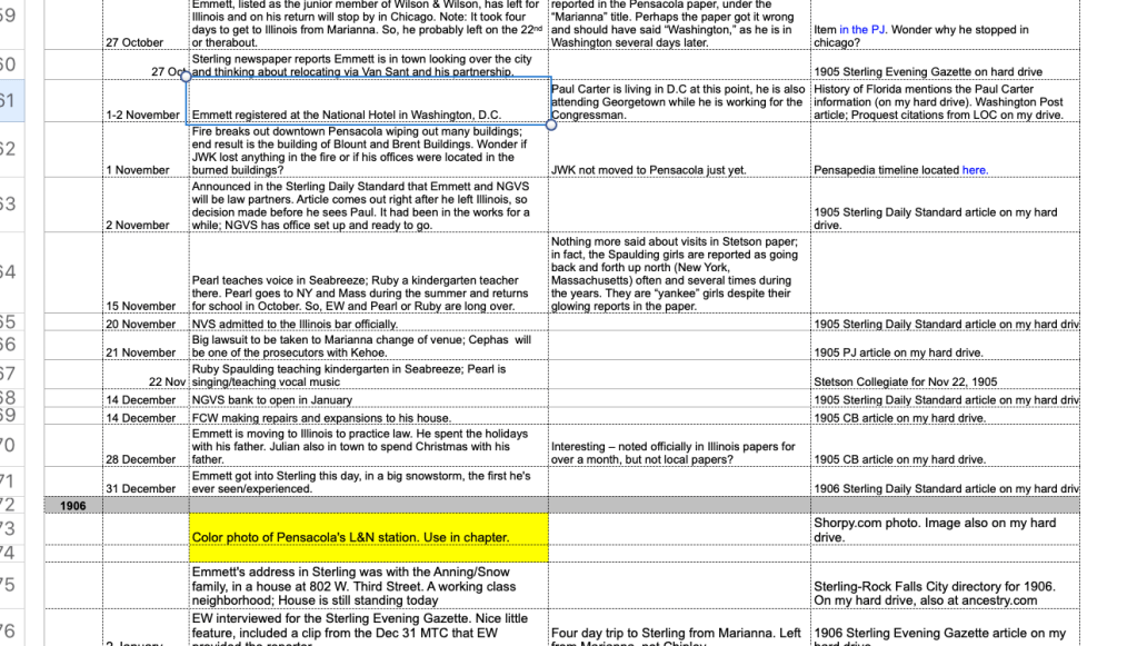 I mention in the chart notes that it seems whatever close or physical relationship between Emmett and Pearl is over, though they may still have corresponded occasionally. A letter to the editor of the Stetson University student newspaper in 1907 from Emmett mentioned that he hadn’t been to visit the campus since he graduated (and, while Pearl was still a student, at least until 1905). Logistically, it seems Emmett would have visited Pearl on campus rather than Seabreeze while he was out of school and working as a lawyer — he may have visited Seabreeze on his own, of course — but if he had, it certainly would have been mentioned in the Seabreeze papers. Alice Spaulding Spangler would have certainly seen to that!