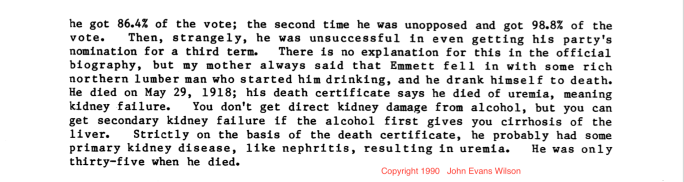 The Wilson genealogy, by John Evans Wilson, mentions a wealthy Northern lumberman who ‘started’ Emmett drinking: