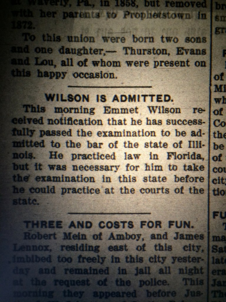 I don’t doubt that Emmett had problems on the bar exam; he was preparing for it before his move to Illinois. I also don’t think he’d have too much trouble building contacts among his legal peers: The association with Nicholas Van Sant pretty much guaranteed he’d have some level of acceptance almost immediately.