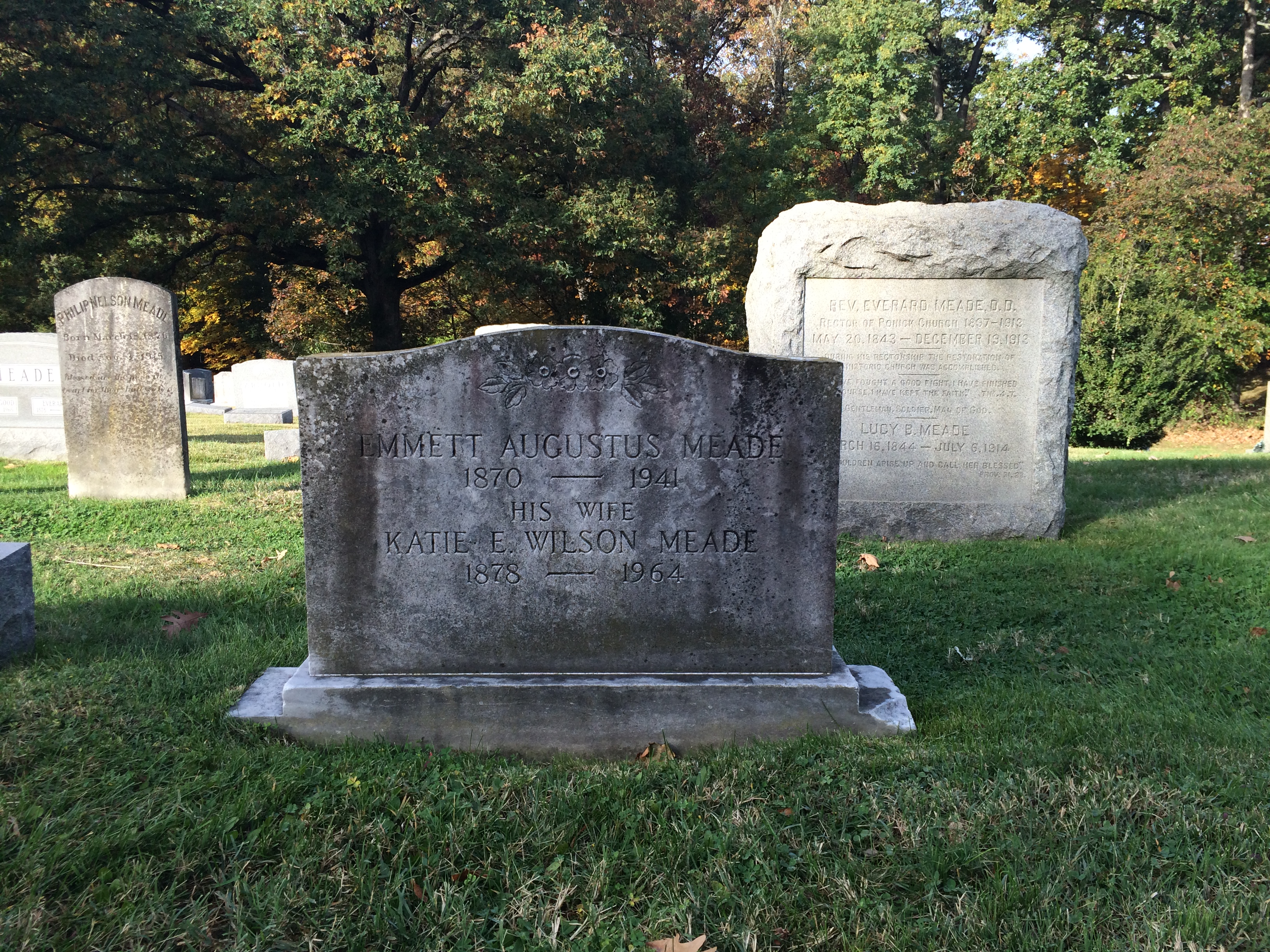As I walked around the cemetery, I wondered if Emmett was here, and I found the headstone for his aunt, Lucy Maxwell Meade. Emmett’s mother, Elizabeth Maxwell Wilson and Lucy were quite close. Lucy died while Emmett was serving in Congress in 1914; just a year earlier her husband (Emmett’s uncle) died in December, 1913; it seems very likely he was here for both their funerals.