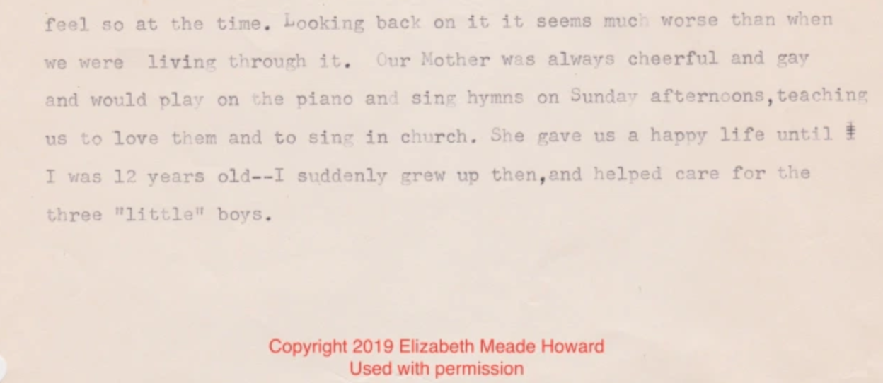 Katie and Emmett Meade had a good marriage; sadly, they had two boys who died almost a year apart from each other. One lived only 10 days; the other, 10 months. I can only imagine what that was like for Katie. I’m no psychiatrist (and, of course, this is conjecture), but I can see how Katie would have dropped everything to take care of her little brother when his health failing.