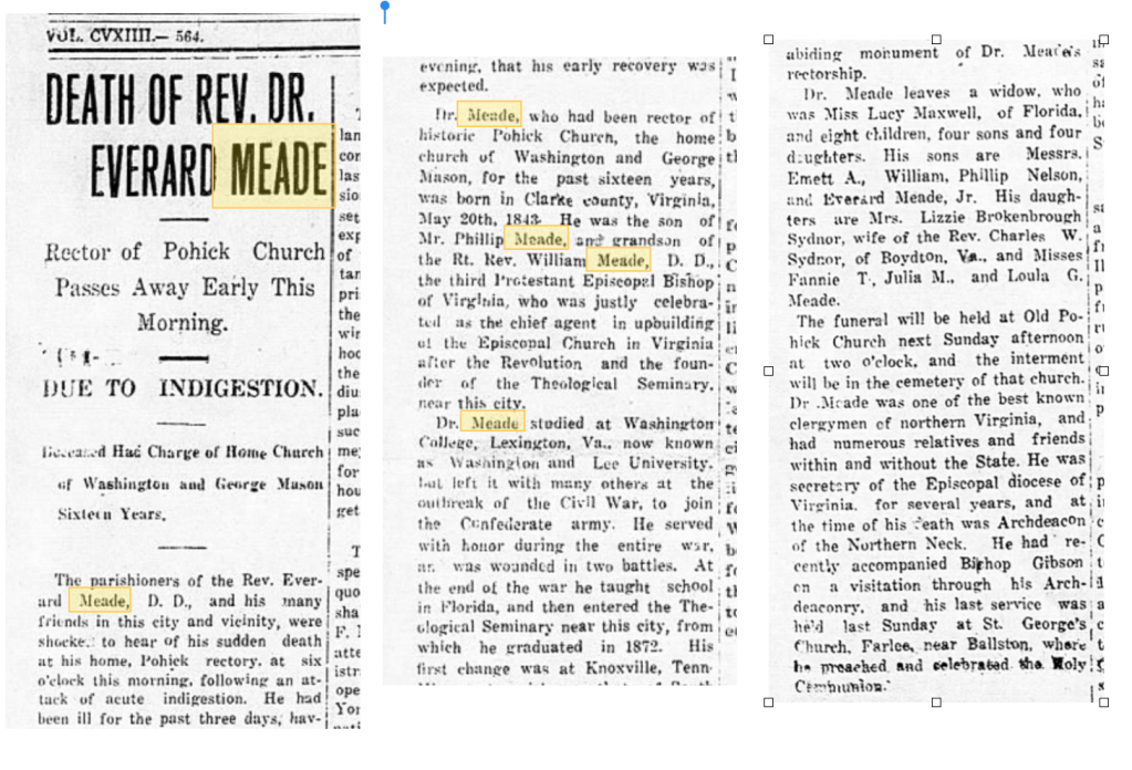 Also luckily, the Pohick Cemetery has excellent records and is open to the public. I reached out to Vonne Troknya, parish secretary for the Pohick Episcopal Church in Lorton, Virginia. I asked her about Katie and her husband, Emmett Meade.