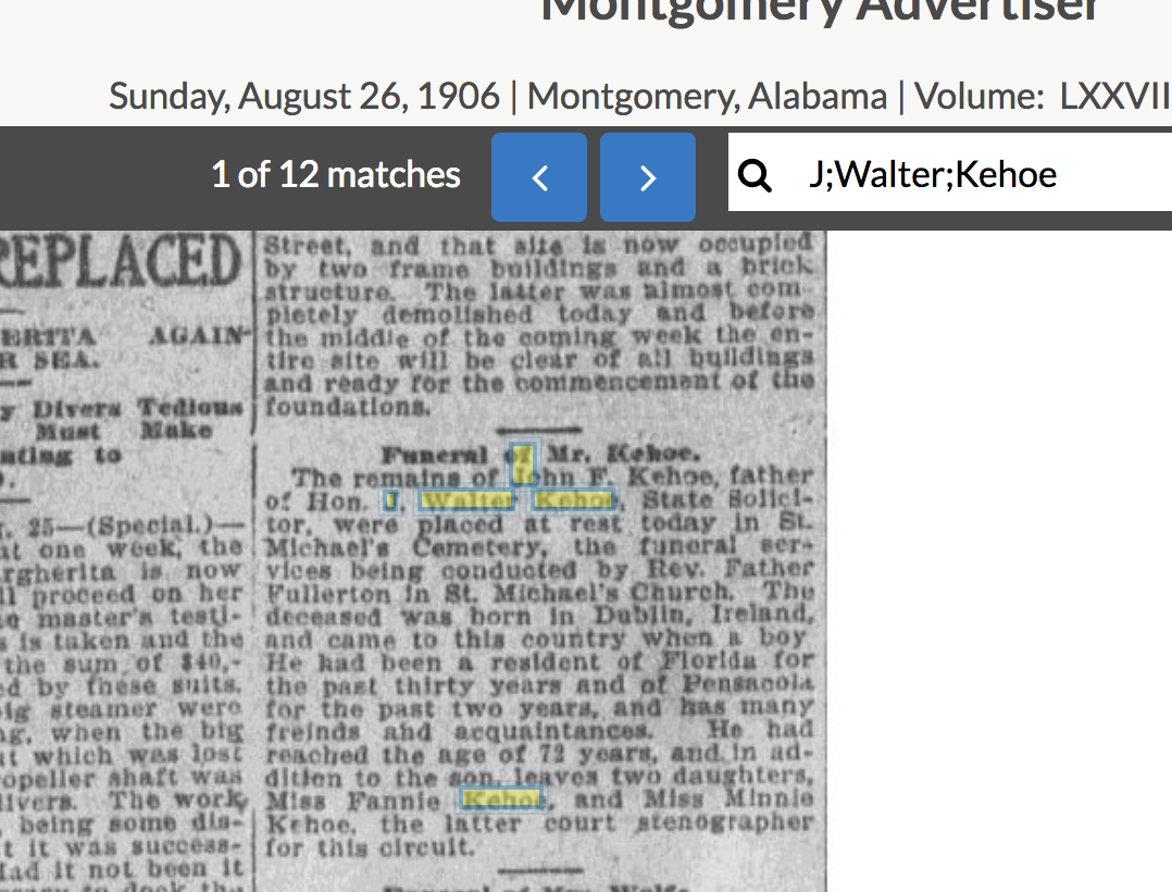 John Kehoe was J. Walter Kehoe’s father — and he was important in West Florida — a self-made, successful businessman who emigrated to the U.S. from Ireland. Unfortunately, John Kehoe died at the end of August, 1906, right before Emmett moved to town. It was probably fortuitous; Walter’s sisters, Minnie and Fanny (spinsters) were living in the family home and while the estate was being settled, likely felt better if there was a man living on the premises.