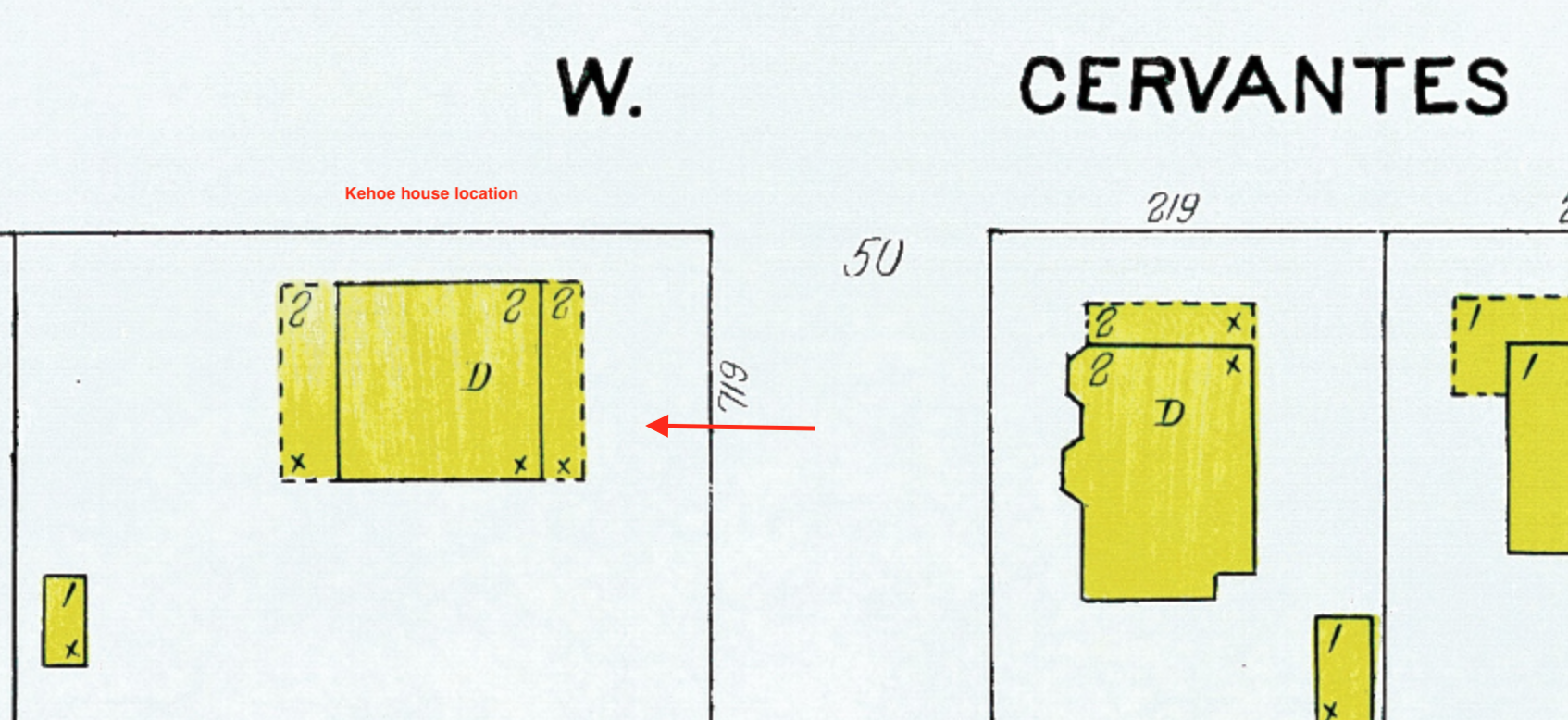 A check with the 1907 edition of the Sanborn Fire Maps (which can be found at the University of Florida archives online) show the structures of those two original houses — and — the structure of the original Kehoe home on page 31 of the Sanborn Fire Maps. This means we have a general idea of what the house structure. It’s not much, but it’s better than nothing!