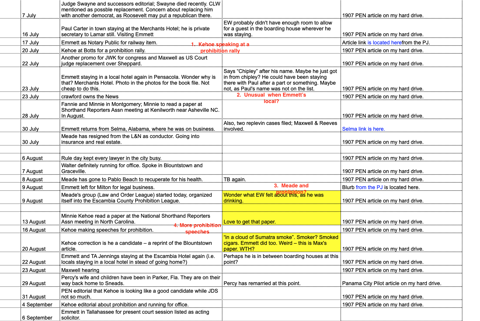The third column from the left is used for my own notes or comments, and the last column tells me where I saved the article, or, if the article exists online in a public database, such as ChroniclingAmerica.gov. For example, you’ll see two links for the “PJ”, which is my shorthand for The Pensacola Journal, which is found online at ChroniclingAmerica.gov; likewise, the Selma, Alabama article is found at that same database.