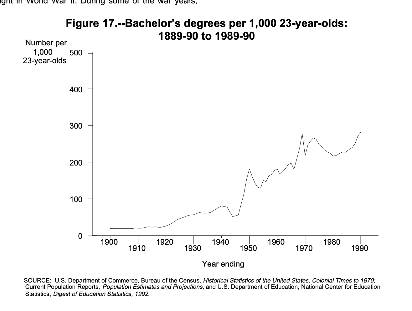 The data in the charts below, from 120 Years of American Education: A Statistical Portrait, supports the idea that Emmett would do anything to reach his goals. That’s not necessarily a negative quality; being driven and dedicated to a specific goal is fine, and credible in most cases.