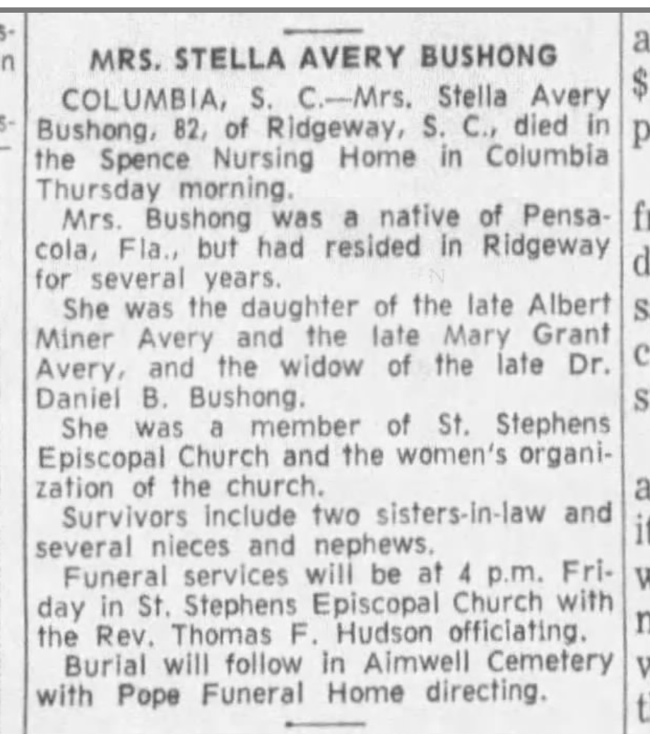 Stella Avery eventually married — at age 49 — to a widower from Maryland, Dr. Daniel Bushong, and died March 29, 1962.