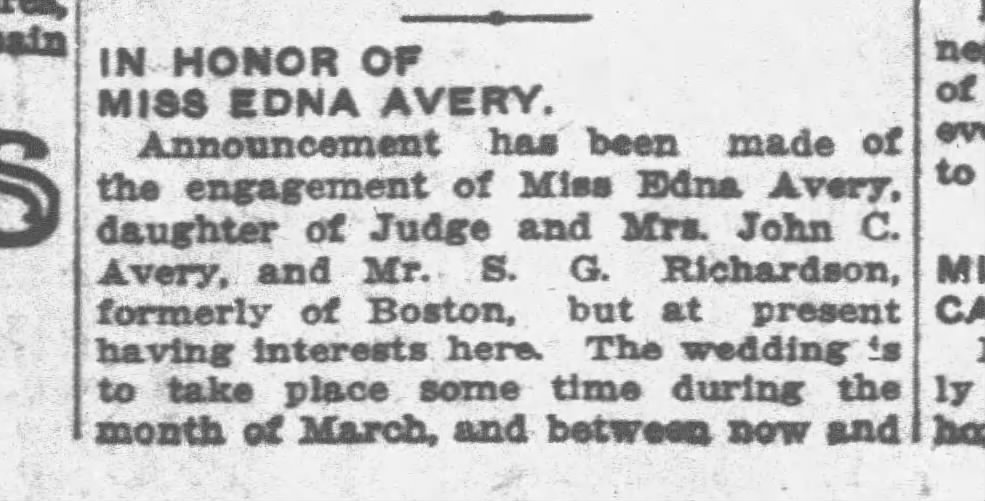 Richardson met and courted Edna Lord Avery, the daughter of Judge and Mrs. John C. Avery during this time; they became engaged in 1910. Edna was 34 when she married Richardson; I thought this was interesting as the median age for women’s first marriage was 21 in 1910. I wonder if, when Edna married, she felt relief, as the local media, family, and friends often encouraged young people to settle down, before ‘it was too late.’