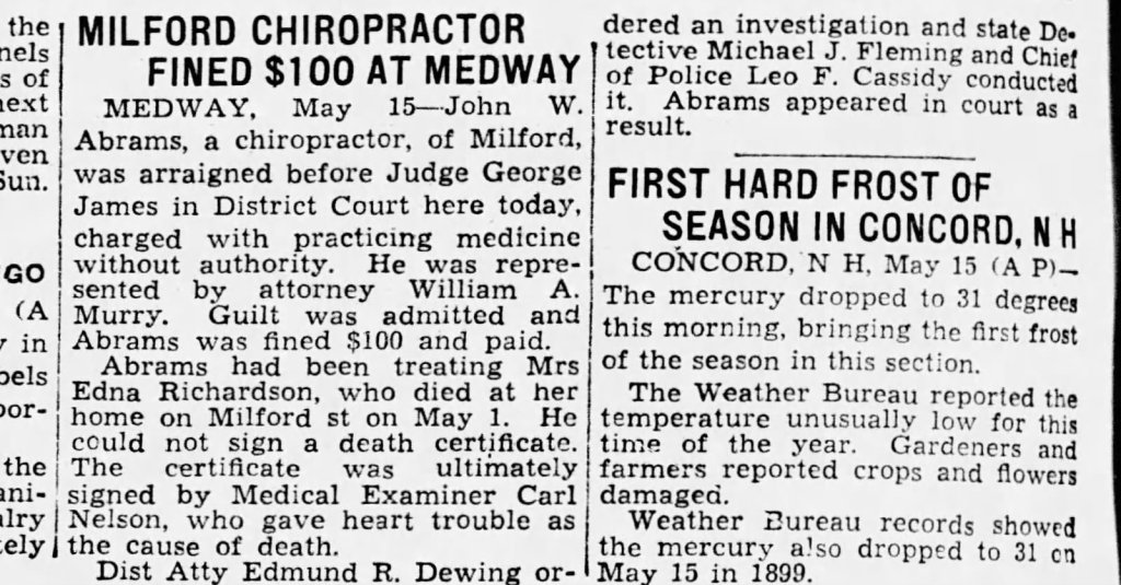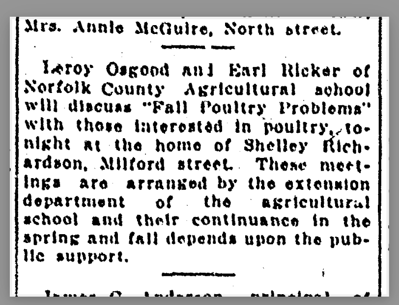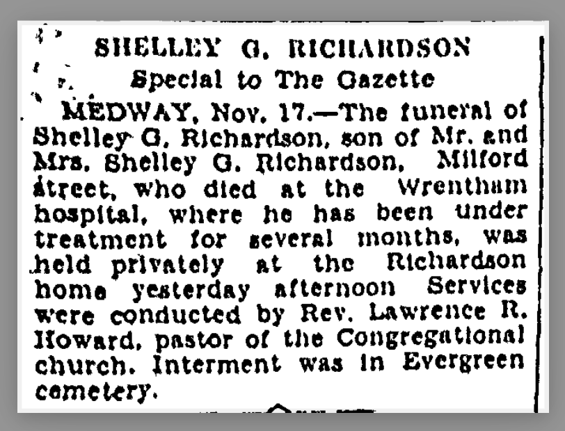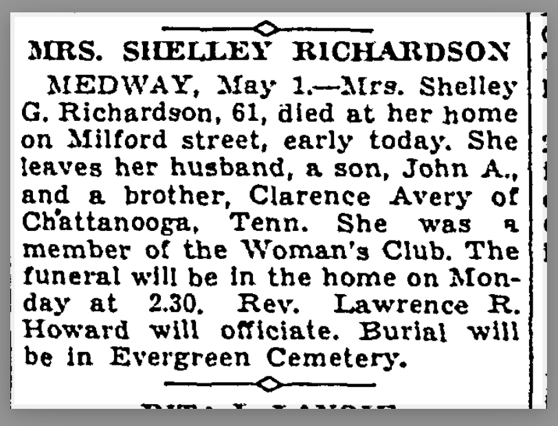 Edna and Shelley moved to Malden, Massachusetts; Richardson became a poultry farmer; Edna was active in women’s clubs and the local congregational church. Other interesting details about the couple from the historic newspapers: Richardson was a tenor in community choirs; he took part in the occasional community play; he enjoyed public service, he was elected to public works offices (one year terms) in Malden.