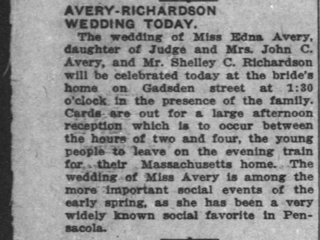 After the wedding, the Richardsons honeymooned, then moved to Boston in May, which was the plan all along. There were a few clues in the contemporary articles that Richardson’s interests in Pensacola were not permanent.