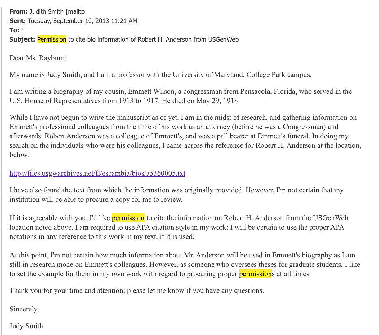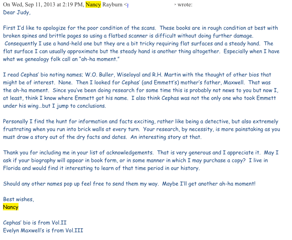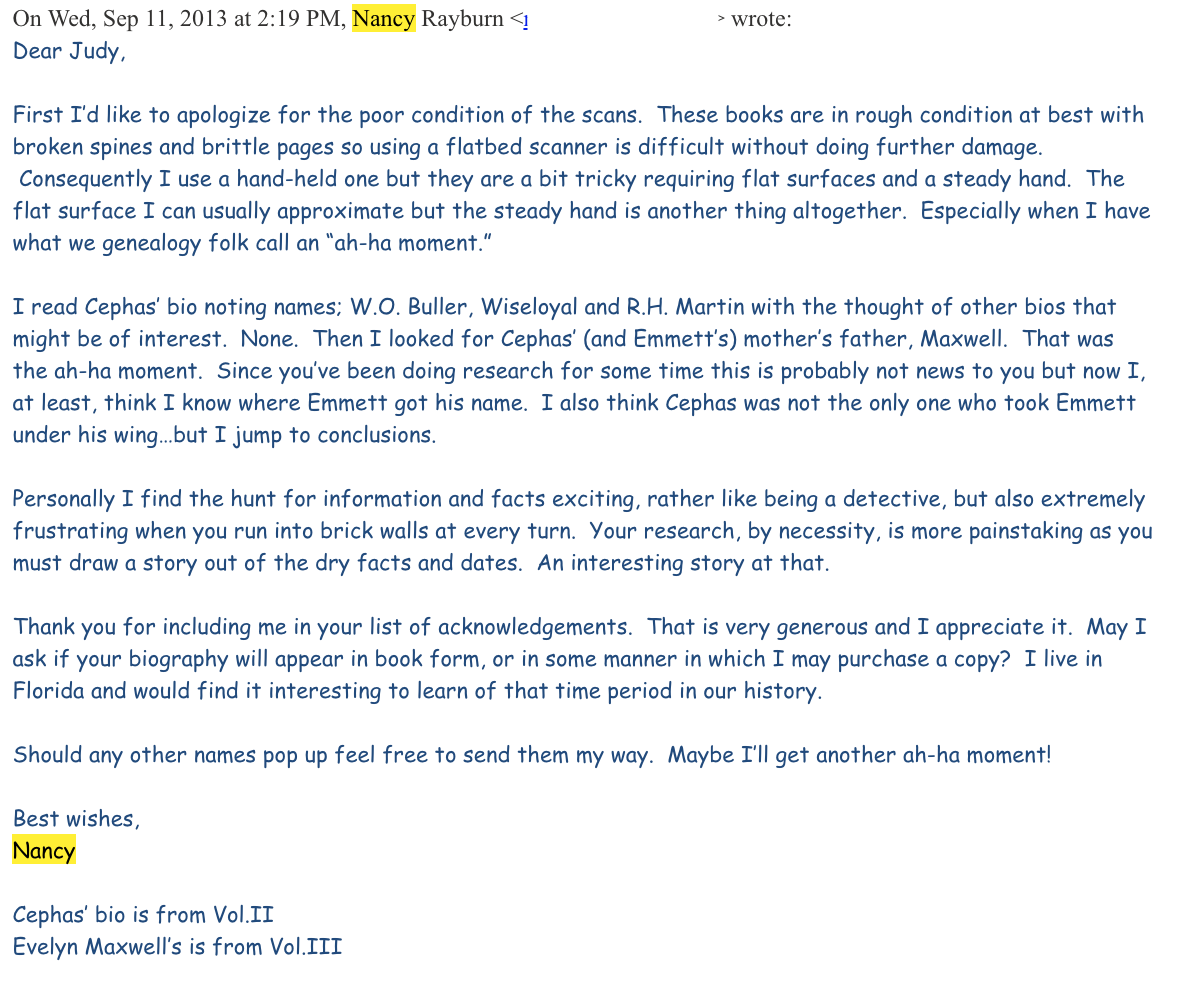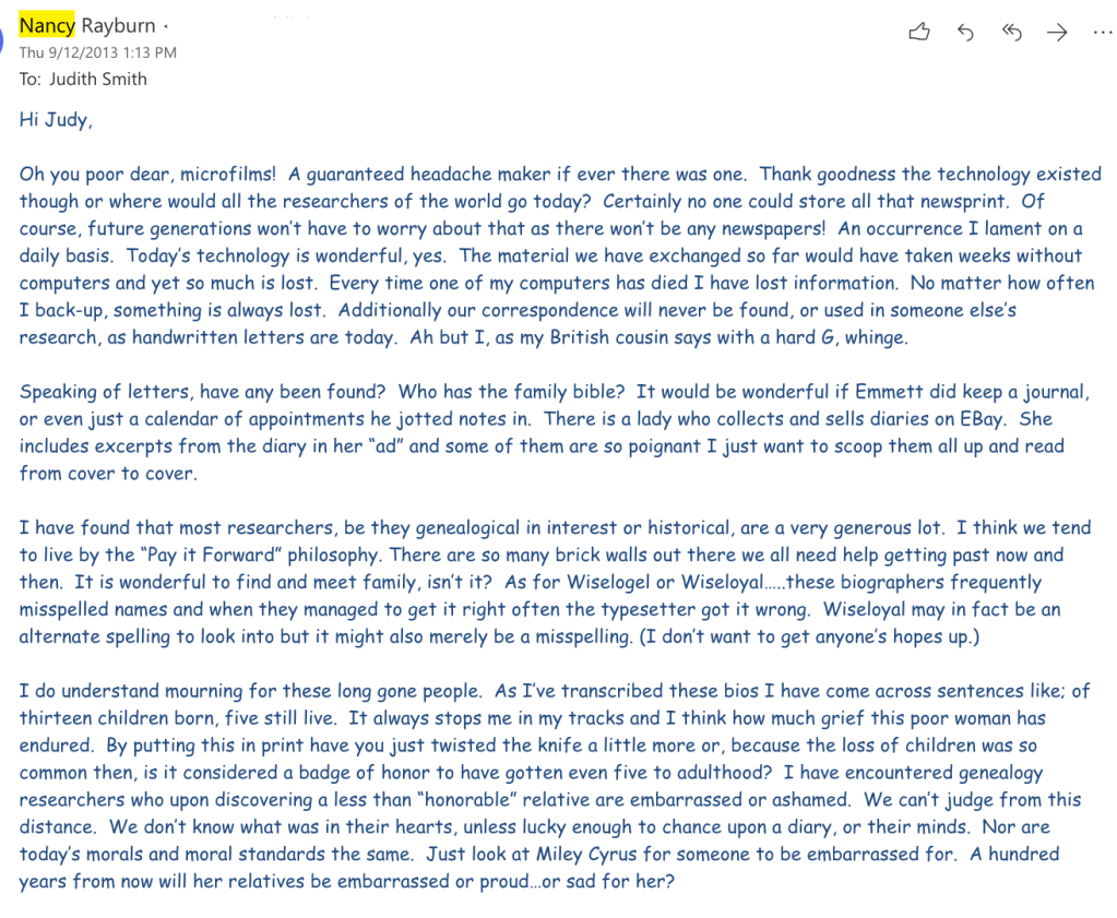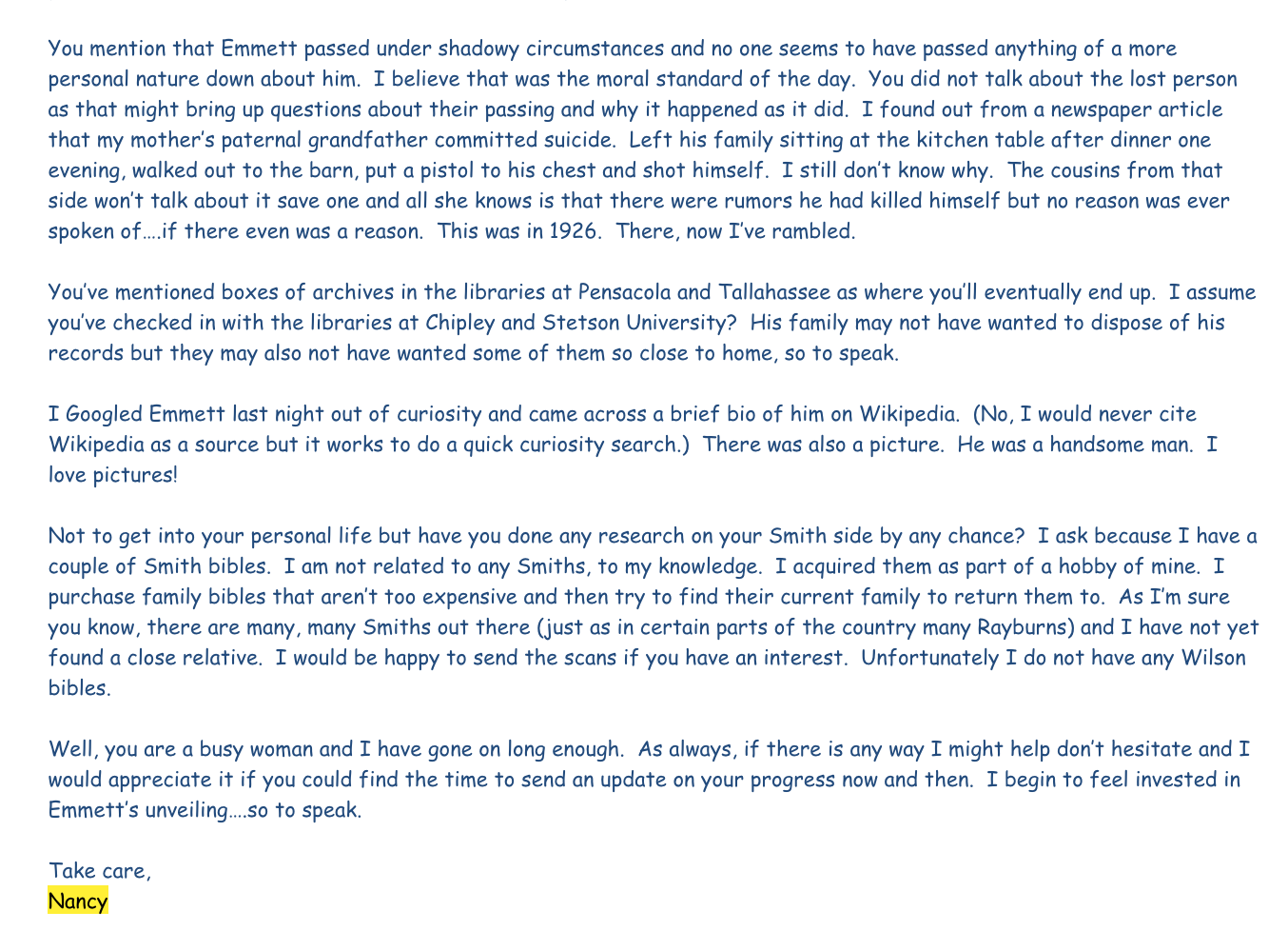 I won’t bore you to death by copying our entire correspondence to date, but as you can see, Nancy has an excellent understanding of the research process, and it has been great discussing different aspects of Emmett’s research. And — we talk via email at least two or three times a week about all kinds of things!